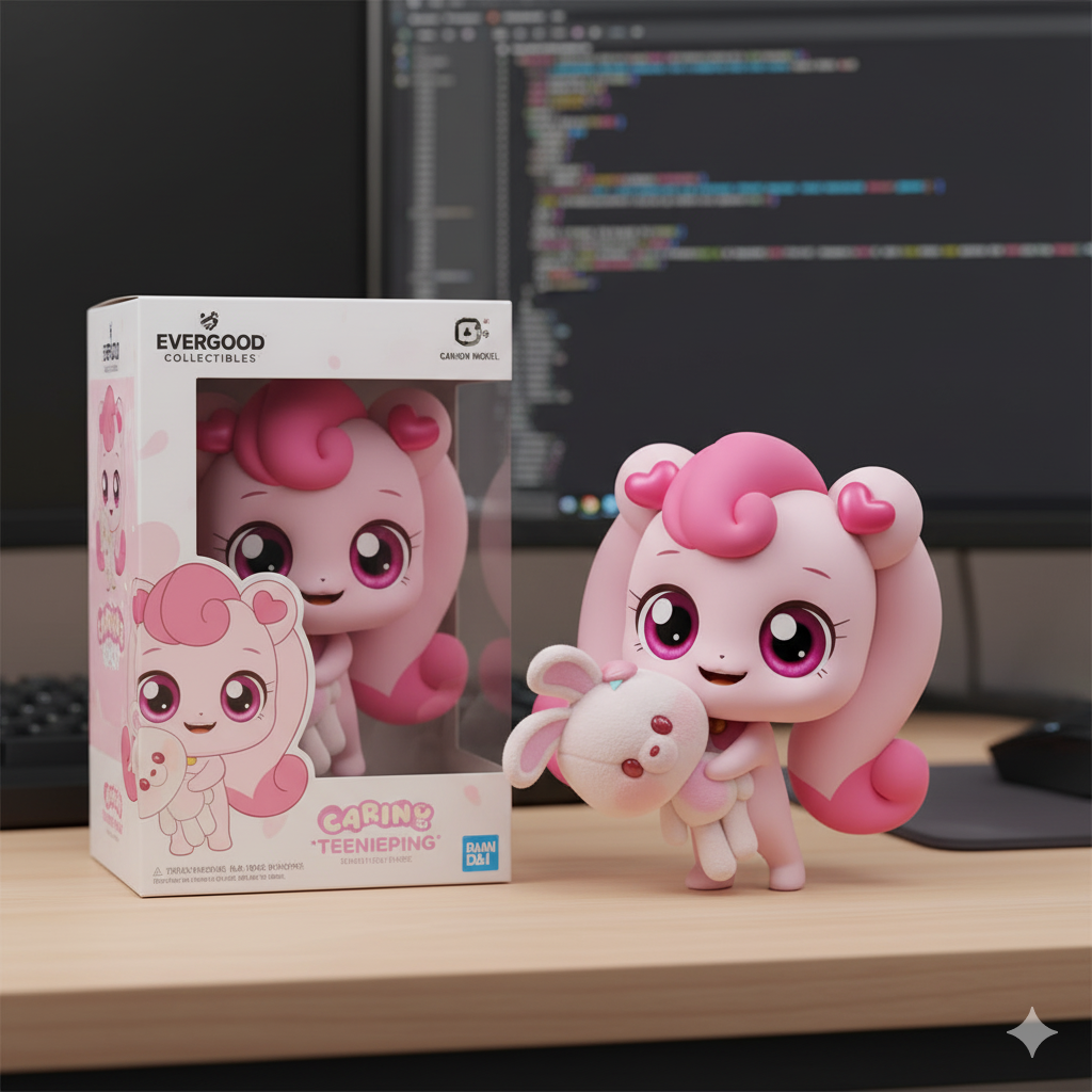 PROMPT : Turn this image into a realistic photo of a collectible standing figure, placed on a computer desk, with its packaging box visible in the background. please make it very similar to face