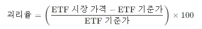 ETF의 가격은 이론적으로 기준가(NAV, Net Asset Value)와 동일해야 합니다. 하지만 실제 시장에서는 ETF의 거래 가격이 기준가보다 높거나 낮게 형성될 수 있는데요. 이를 괴리율(%)이라고 하며, 다음과 같이 계산합니다.