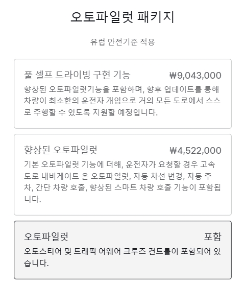 | 후륜구동 (RWD) | 5,199만 원 | 풀 셀프 드라이빙 구현 기능 (904만원) 향상된 오토파일럿 (452만원) |