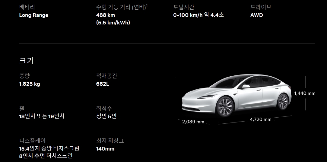 테슬라 모델3 제원은 위와 같습니다.